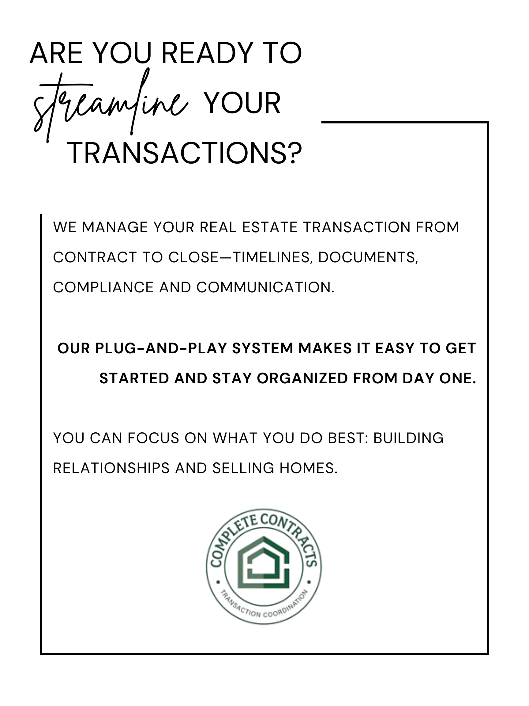LET’S GET STARTED: SCHEDULE A CALL NEW AGENT ONBOARDING Learn more: TC GUIDE VISIT THE FULL COMPLETE CONTRACTS WEBSITE JOIN the NEWSLETTER: JOIN HERE Send us a message & we’ll get back to you shortly.